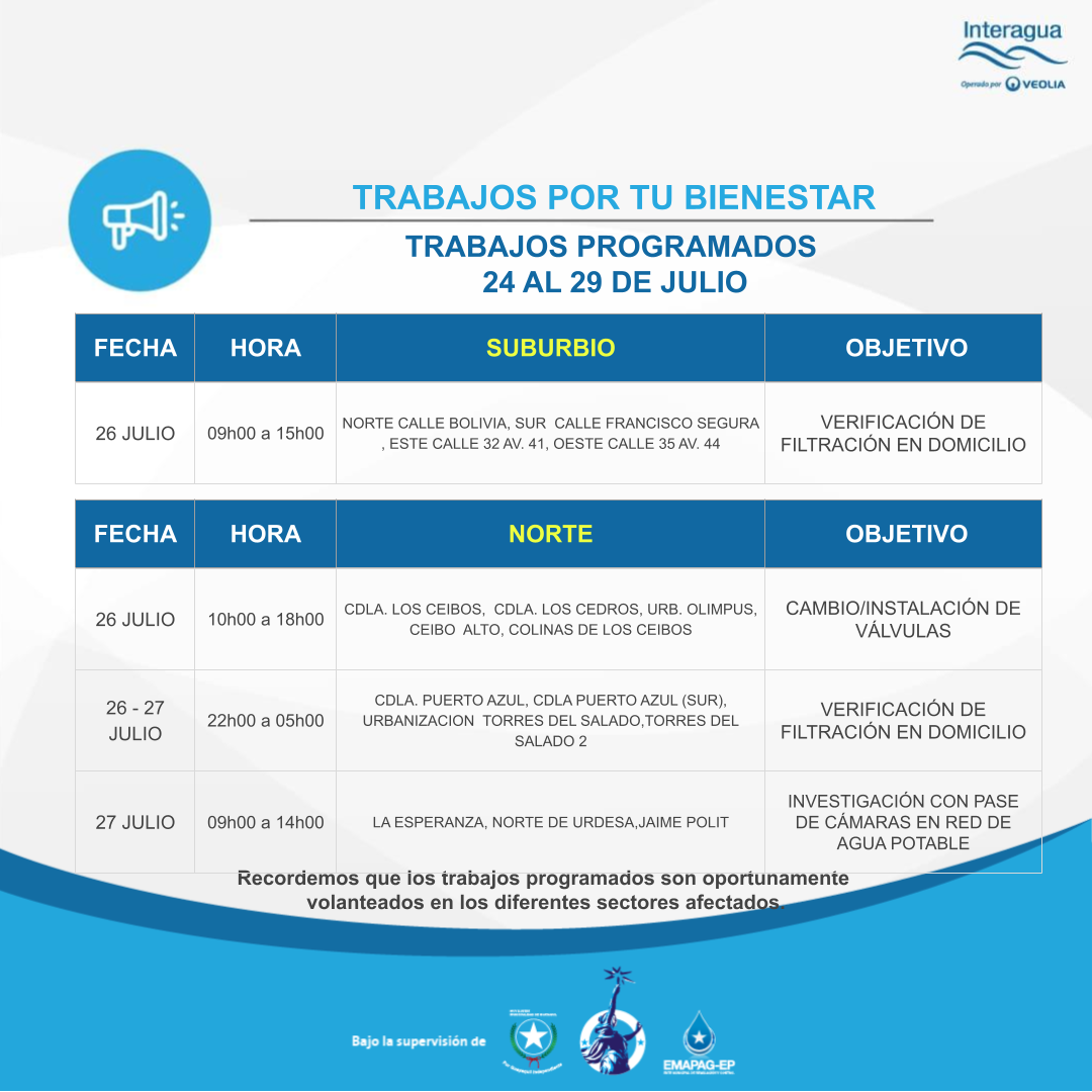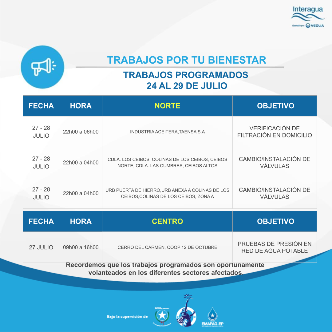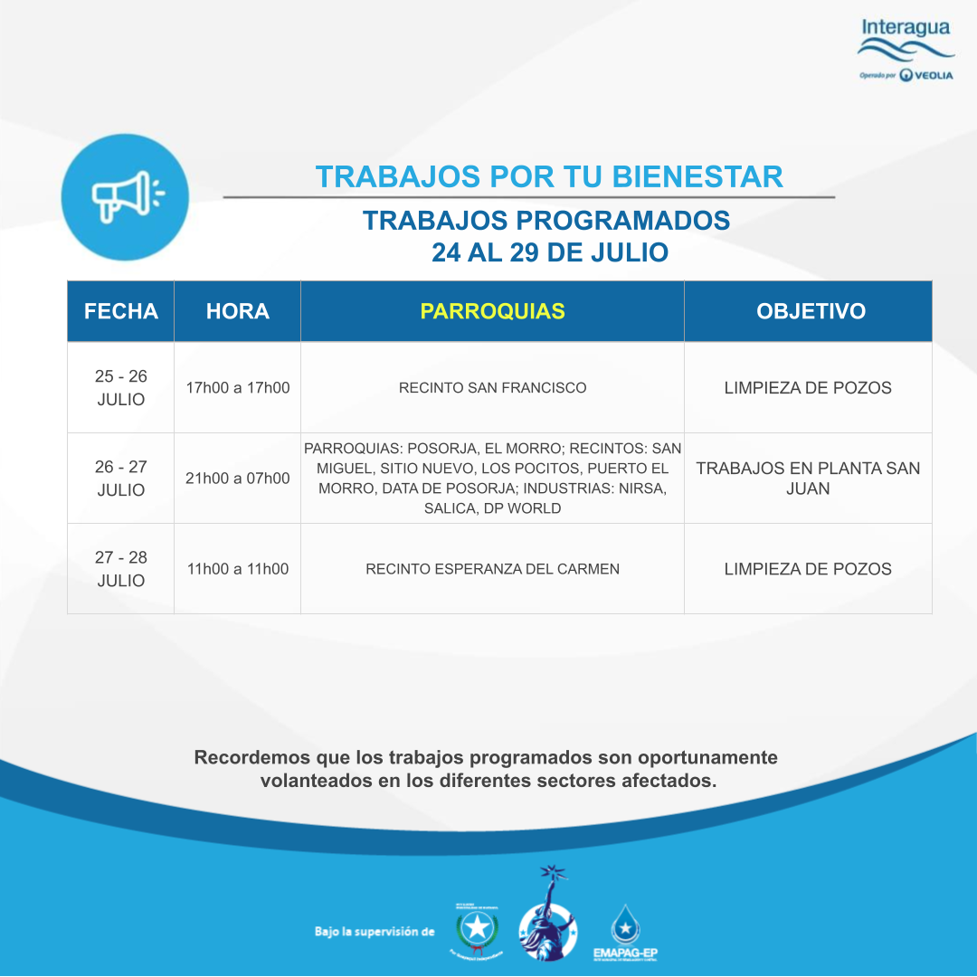 Interrupción: Trabajos Programados del 24 al 29 de julio - 25/07/2023 Inicio Interrupciones Interrupción: Trabajos Programados del 24 al 29 de julio - 25/07/2023 Más videos relacionados Entrevista invernal Interagua: Proceso de Captación y Bombeo Planta ¨La Toma¨ Interagua: Complejo ¨La Toma¨