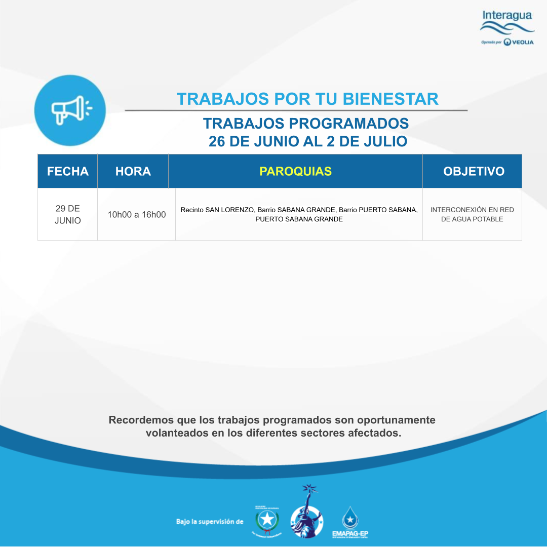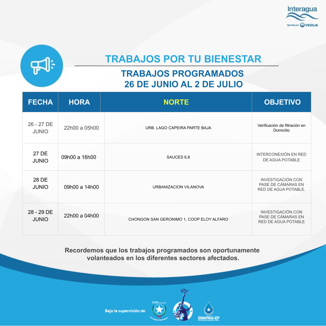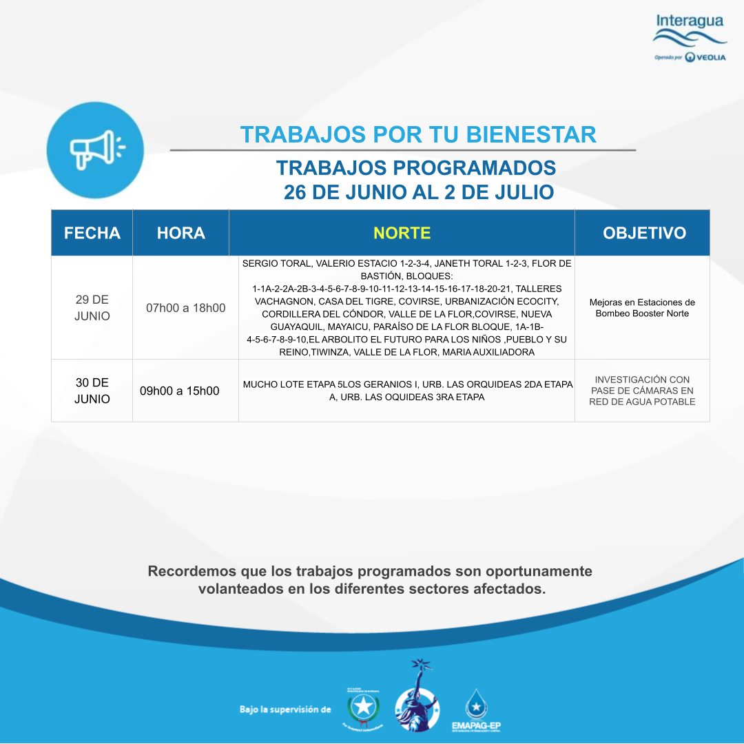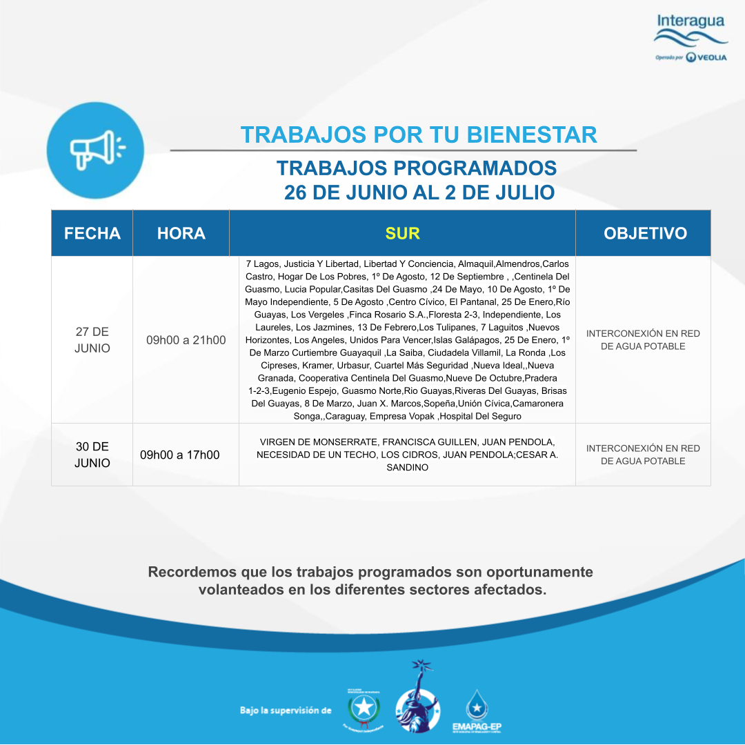 Interrupción: Trabajos Programados del 26 de junio al 2 de julio - 23/06/2023 Inicio Interrupciones Interrupción: Trabajos Programados del 26 de junio al 2 de julio - 23/06/2023 Más videos relacionados Entrevista invernal Interagua: Proceso de Captación y Bombeo Planta ¨La Toma¨ Interagua: Complejo ¨La Toma¨