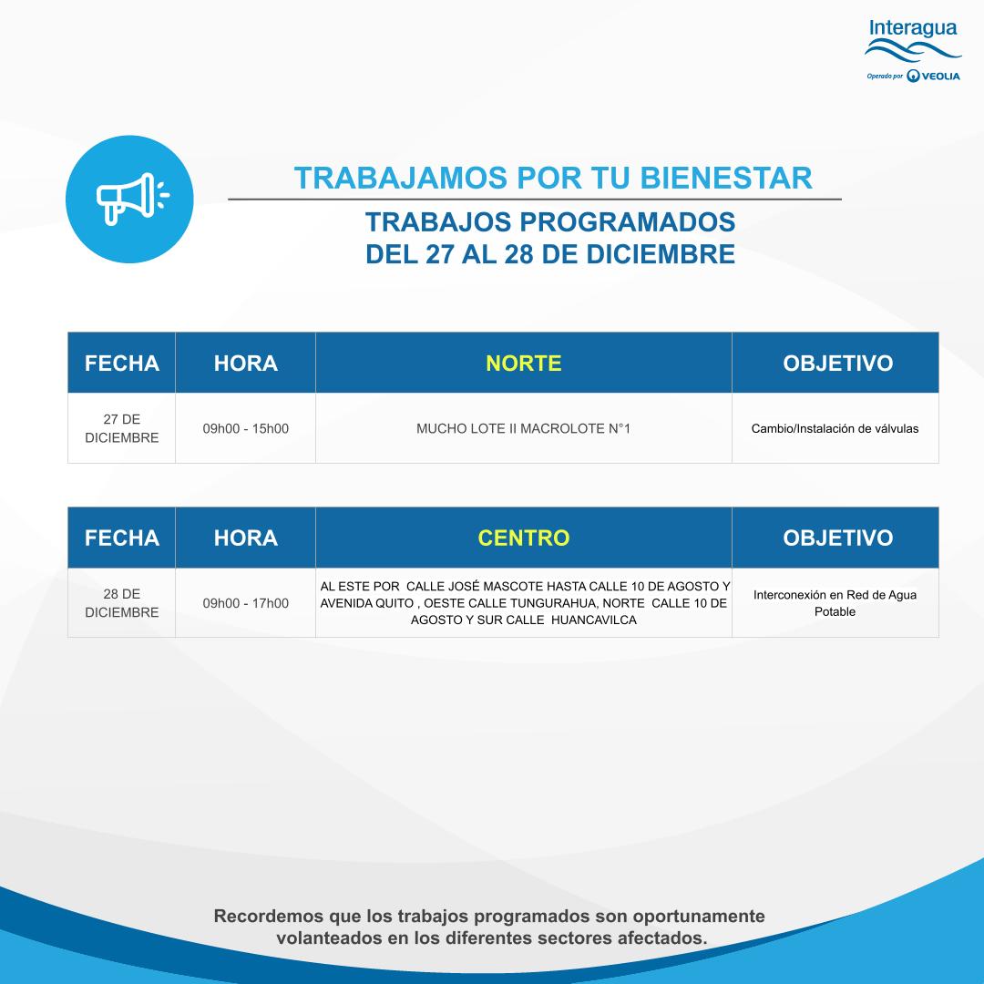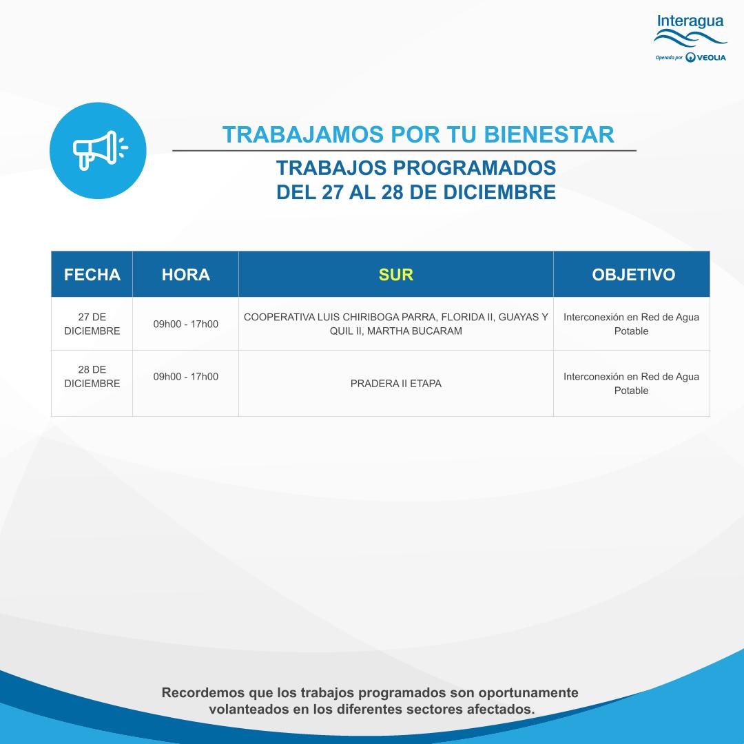 Interrupción: Trabajos programados del 27 al 28 de diciembre Inicio Interrupciones Interrupción: Trabajos programados del 27 al 28 de diciembre Más videos relacionados Entrevista invernal Interagua: Proceso de Captación y Bombeo Planta ¨La Toma¨ Interagua: Complejo ¨La Toma¨