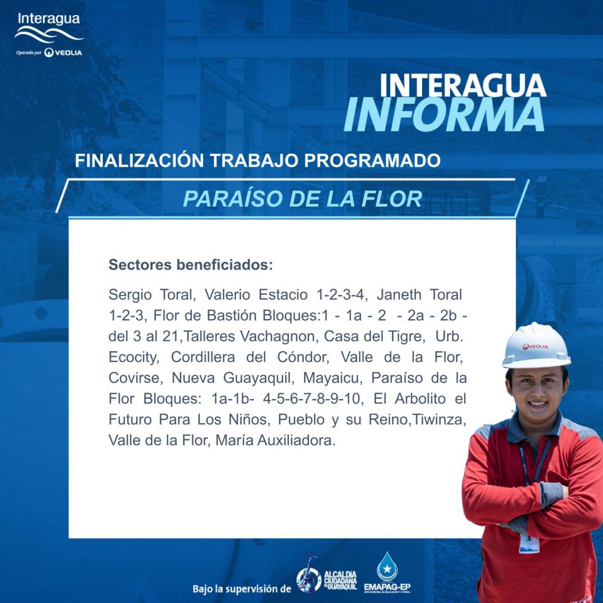 Restablecimiento: Trabajo Programado Sistema Booster Norte (Paraíso de la Flor) - 29/06/2023 Inicio Interrupciones Restablecimiento: Trabajo Programado Sistema Booster Norte (Paraíso de la Flor) - 29/06/2023 Más videos relacionados Entrevista invernal Interagua: Proceso de Captación y Bombeo Planta ¨La Toma¨ Interagua: Complejo ¨La Toma¨