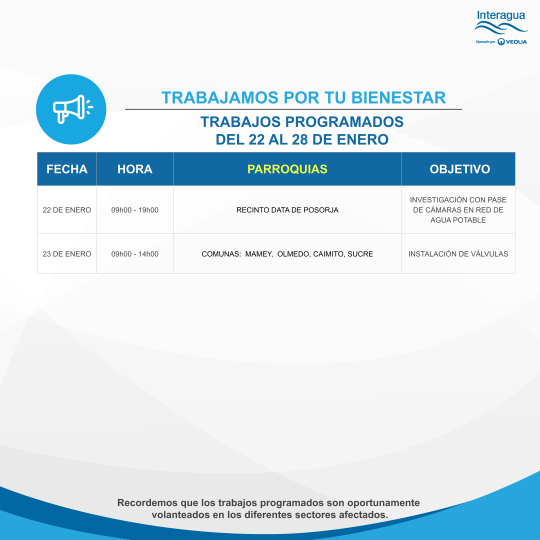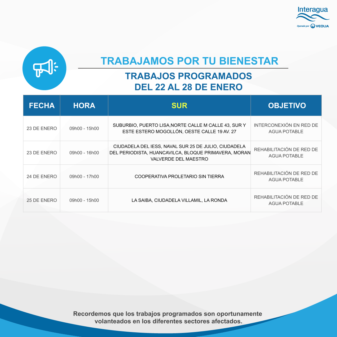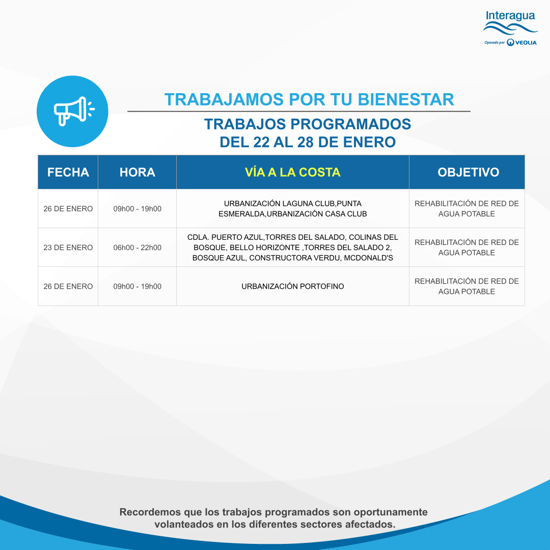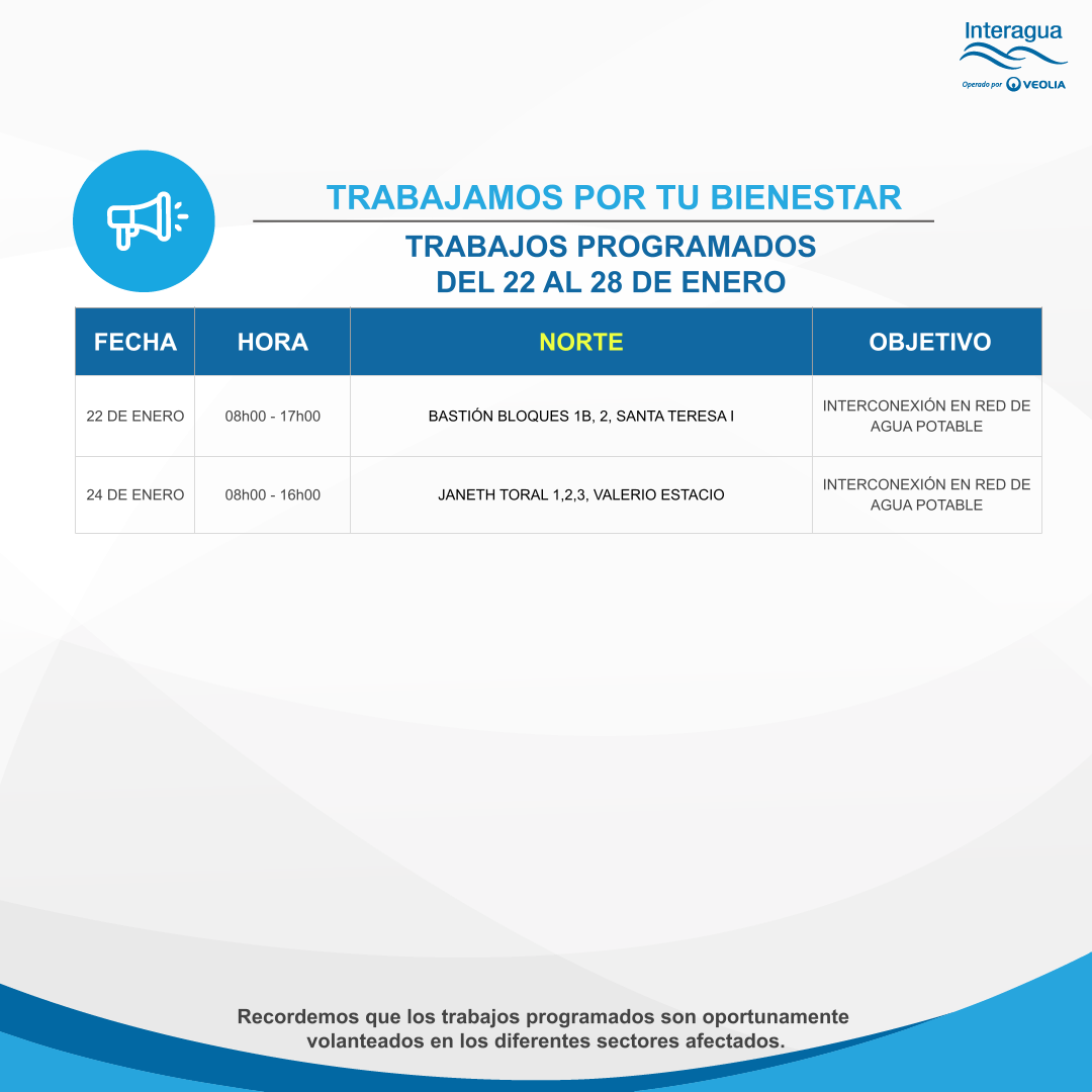 Trabajos programados del 22 al 28 de enero Inicio Interrupciones Trabajos programados del 22 al 28 de enero Más videos relacionados Entrevista invernal Interagua: Proceso de Captación y Bombeo Planta ¨La Toma¨ Interagua: Complejo ¨La Toma¨