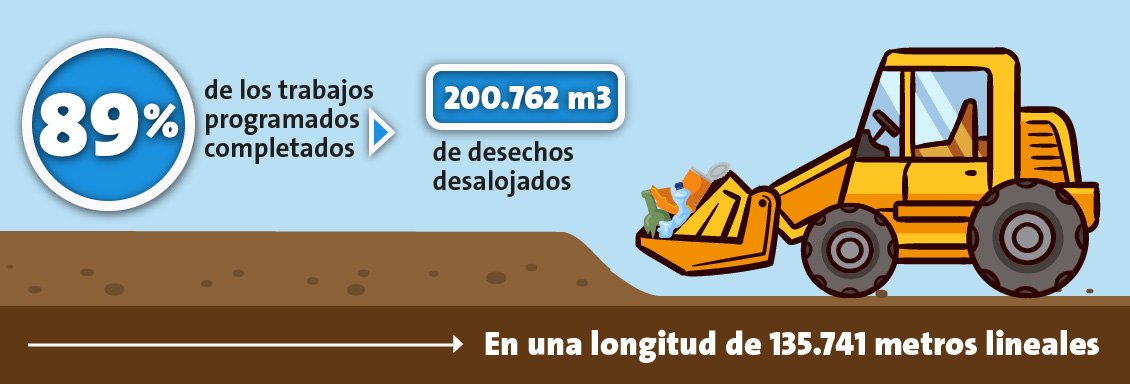 Al momento se ha completado el 89,18% de los trabajos programados con un total de 200762 m3 desalojados sobre la longitud total 135741,66 metros lineales.