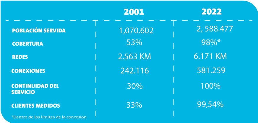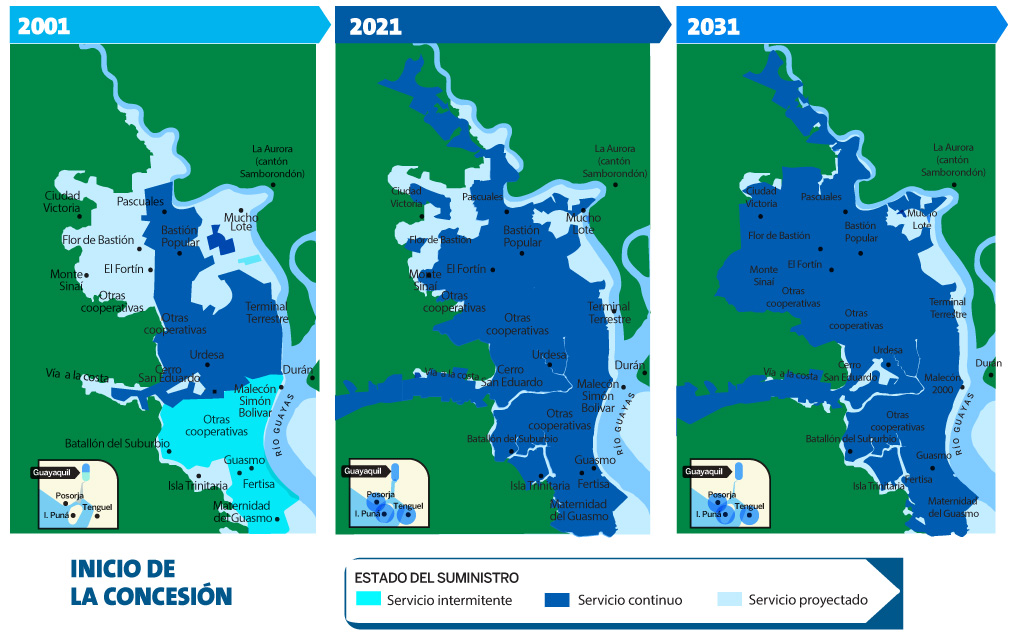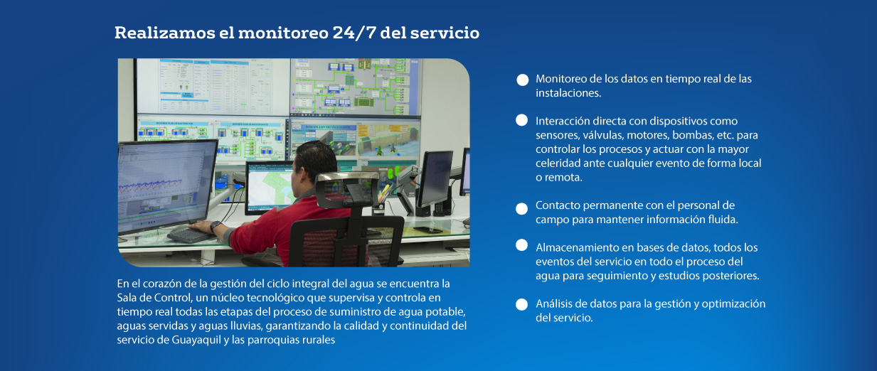 Para garantizar el acceso al servicio esencial de agua potable por medio de la concesión, que abarca una extensión de 5.200 km2 brindando servicio a la zona urbana del Cantón Guayaquil y 5 parroquias rurales, el equipo especializado de técnicos opera en distintos puntos de la Perla del Pacífico por más de dos décadas. Desde el inicio se han enfrentado diferentes desafíos, sin embargo, gracias al arduo esfuerzo realizado podemos mejorar los resultados del servicio año a año.