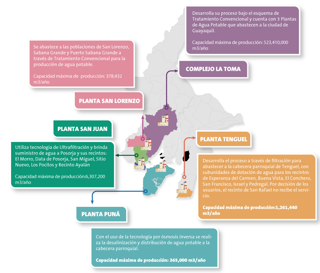 Actualmente producimos 386 millones de m3 anuales de agua, que abastecen a alrededor de 2.5 millones de personas. Esta distribución se realiza por medio de 6.171 kilómetros de red de agua potable conectados a tres plantas ubicadas en Guayaquil y cuatro en parroquias que entregan agua potable cumpliendo los parámetros acordados en la norma INEN 1108 y contrato de concesión. Para cumplir con el proceso de la distribución diaria contamos también con 4 acueductos principales, 68 estaciones de bombeo, 14 estaciones de re-cloración, 42 reservorios, 182 estaciones reguladoras de presión, 890 equipos de medición de caudal, presión, nivel y calidad, 253 distritos de medición continua y más de 1.037 sectores hidráulicos.