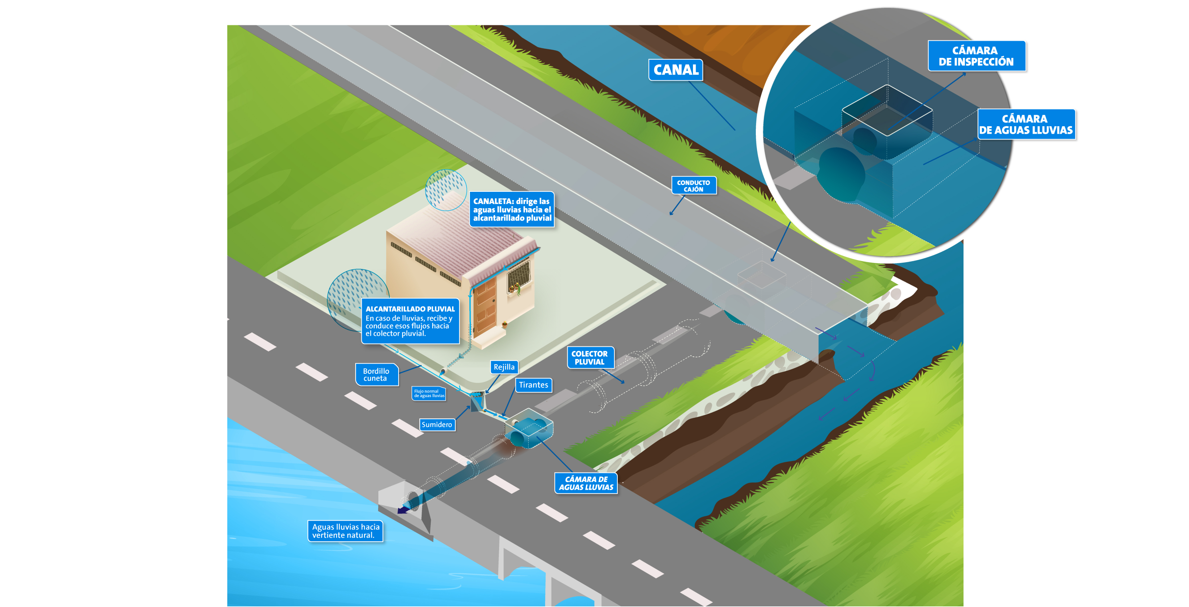 Es el sistema de tuberías, sumideros, colectores y canales abiertos o cerrados que recogen las aguas provenientes de las lluvias y las llevan a los puntos de descarga que pueden ser esteros o ríos. Estos sistemas tienen por finalidad ayudar a retirar las lluvias de la ciudad y así evitar anegamientos. Dentro del compromiso con los habitantes de la ciudad, Interagua ejecuta estrategias preventivas todo el año, trabaja en acciones durante la estación invernal y desarrolla planes de corto, mediano y largo plazo para la optimización del sistema pluvial.